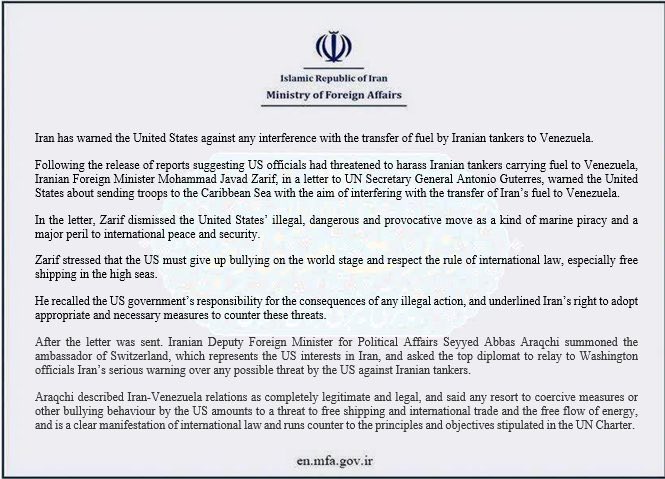The Iranian foreign ministry has sent a letter, warning the US against taking any action against the Iranian tankers carrying fuel to Venezuela and says that any threat against them will be met with a 'firm response'