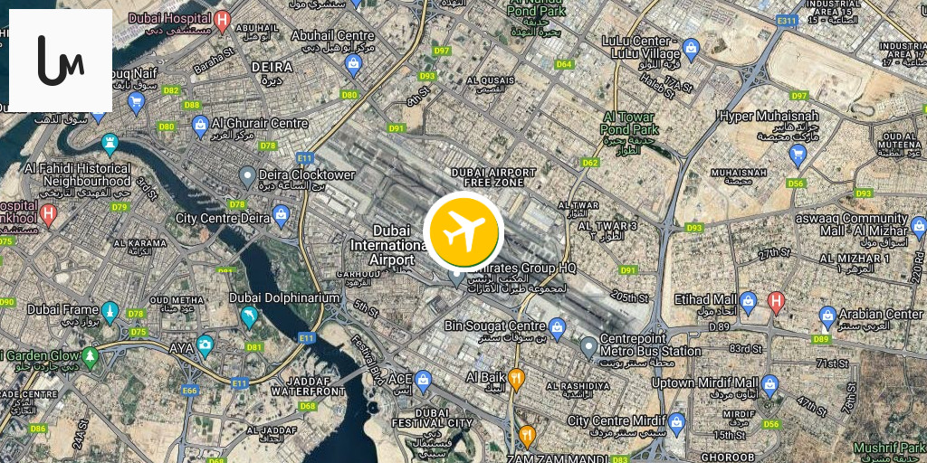 Geolocation of a photo showing smoke rising from the direction of the Dubai International Airport.